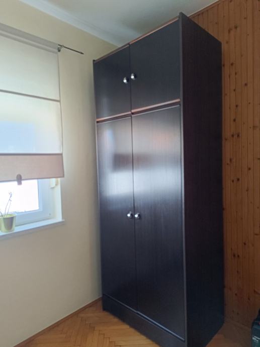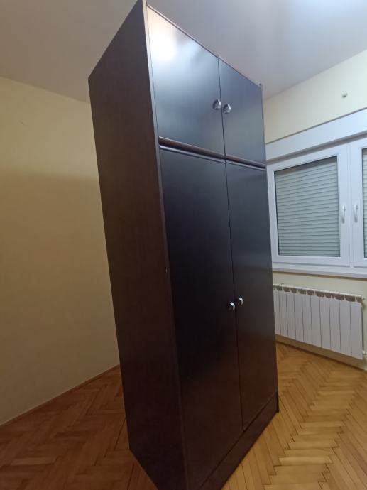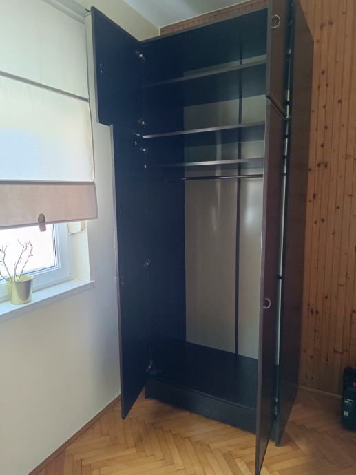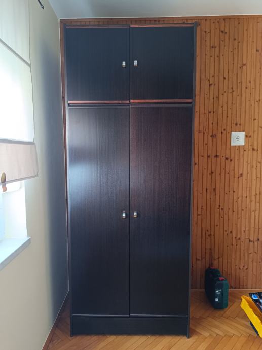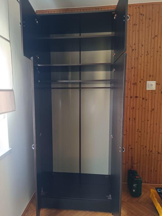 Prodajem dvokrilni ormar crne boje. Ormar čini glavni dio koji ima policu i vješalicu, gornji dio sa policom te ladica na dnu. Osobno preuzimanje.