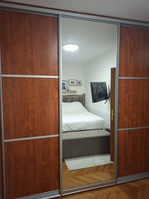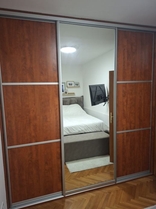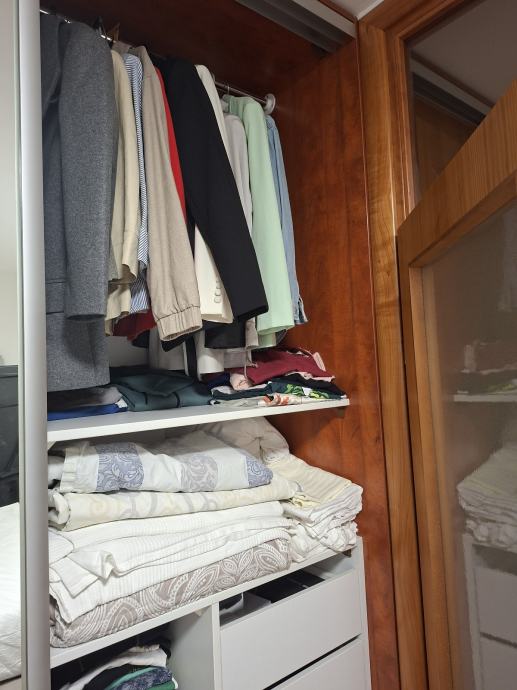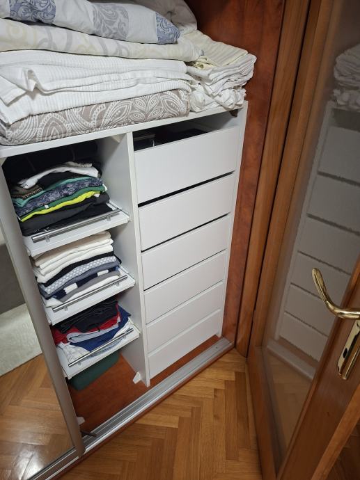 Prodajem garderobni ormar, komplet sa kriznim vratima i unutra je središnji dio samo za vješanje u 2 razine a lijevo je dio sa sirokim izvlačnim policama, a desni u kojem je ladicar i izvlacne police i gornji dio za vjesanje. Dimenzije: dužina 252cm, visina 263 cm i dubina 63cm. Sve u funkciji. Mislim da je cijena korektno obzirom da samo sustav vodilica za klizna vrata kosta toliko bez panela. Razlog prodaje je taj sto smo kupili novi