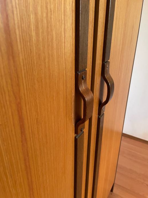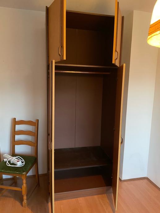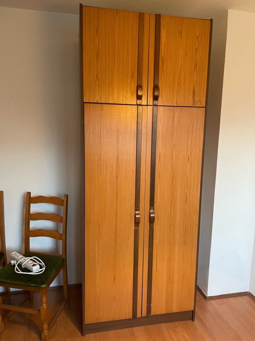 Prodajem garderobni ormar u toplijoj drvenoj boji s tamnosmeđim detaljima. Ormar se sastoji od dva dijela – gornjeg manjeg prostora s dvije vratnice te donjeg, većeg dijela s dvije visoke vratnice. U unutrašnjosti se nalazi šipka za vješanje odjeće te police, što omogućuje dobru organizaciju prostora. Vrata su opremljena karakterističnim drvenim ručkama u dobrom stanju.