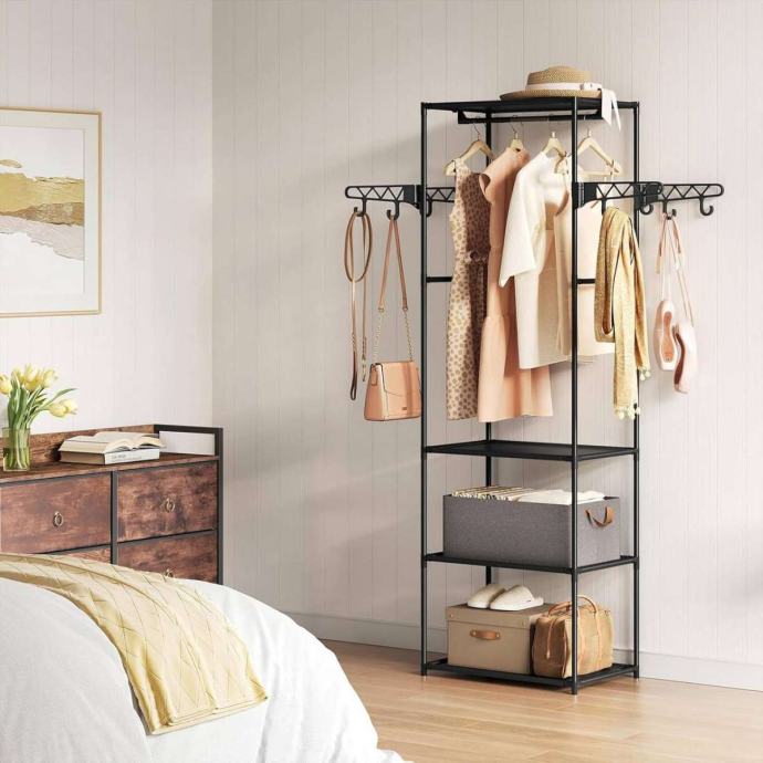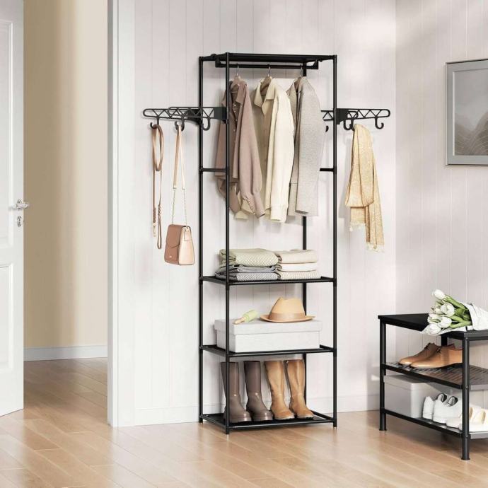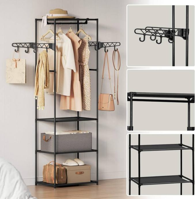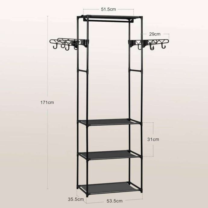 Ovaj kompaktni garderobni stalak dimenzija 53,5 x 171 x 35,5 cm idealan je za male prostore poput spavaćih soba, hodnika, dnevnih soba ili garderoba. Sastoji se od šipke za vješanje jakni, košulja i haljina, četiri kukice za šešire, torbe ili šalove te tri police od netkanog materijala za cipele, kutije i ostale stvari.