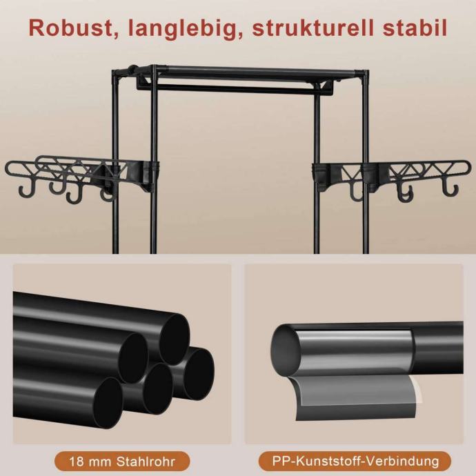 Stalak je izrađen od kvalitetnih metalnih cijevi, što osigurava stabilnost, otpornost na hrđu i dugotrajnost. Netkani materijal polica prozračan je i jednostavan za čišćenje, a plastične kukice i spojevi čvrsti su i otporni na lomljenje. Ukupna nosivost uključuje 20 kg za šipku, 10 kg po polici i 2,5 kg po kukici.