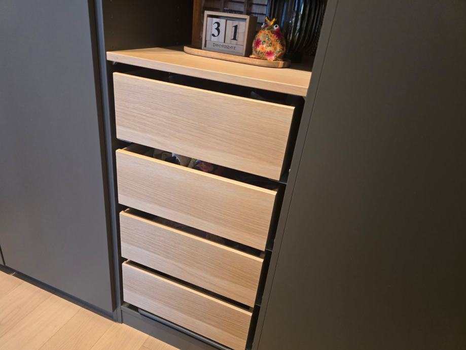 Srednji korpusi su ladice i police. Desni korpus je prazan, bez polica.