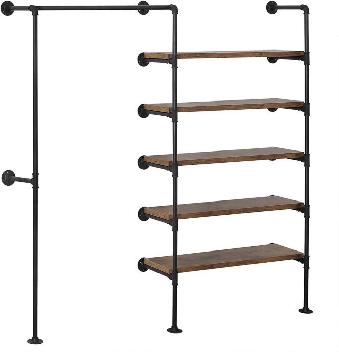 Ova otvorena garderoba u industrijskom stilu predstavlja idealno rješenje za uštedu prostora uz veliki kapacitet pohrane. Inspirirana izgledom vodovodnih cijevi, kombinira mat crne metalne cijevi i MDF police u dekoru drveta, čime se savršeno uklapa u spavaće sobe, hodnike, garderobe ili čak prodajne prostore.