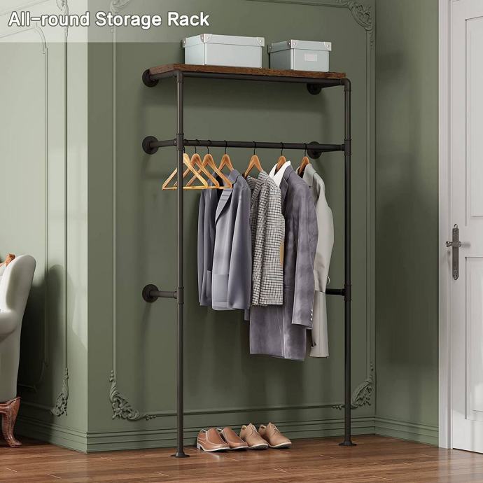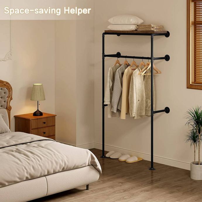 Ova zidna vješalica za odjeću u industrijsko-vintage stilu idealno je rješenje za walk-in garderobe i prostore gdje je važno maksimalno iskoristiti zidni prostor. Kombinira šipku za vješanje i gornju policu, čime omogućuje uredno i pregledno odlaganje odjeće i dodataka uz minimalno zauzimanje prostora.