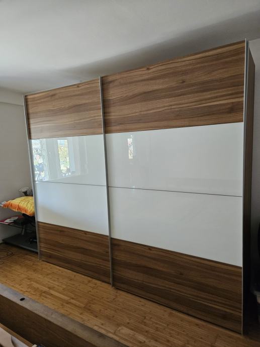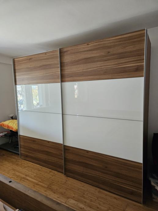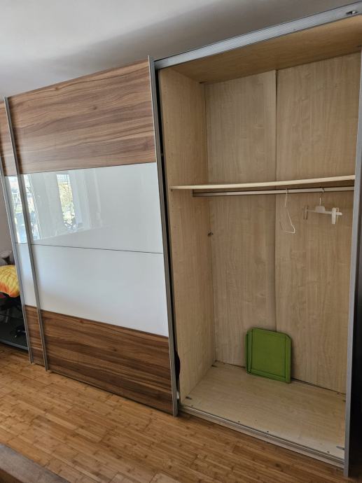 Prodajem klizni ormar za spavaću sobu 2400 x 2200 u boji lješnjak sa bijelim staklom.