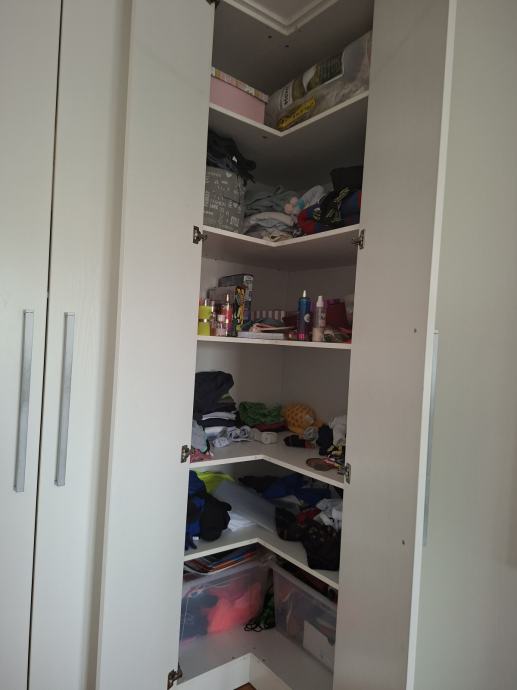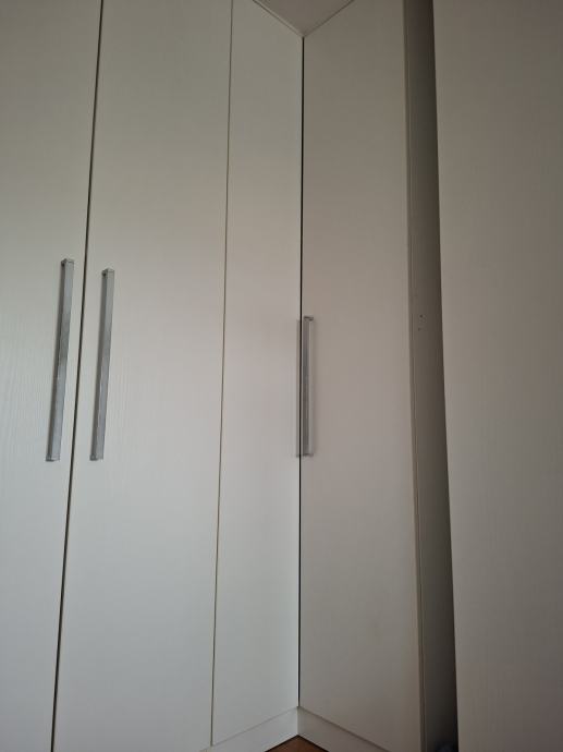 Prodajem kutni ormar rađen po mjeri. Dubina 50 cm, visina 249 cm, svaka strana širine 90 cm. Ormar ima sitna oštečenja nastala prilikom odspajanja od drugog ormara.