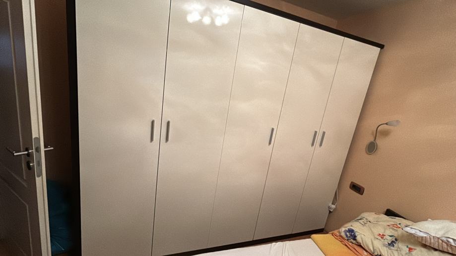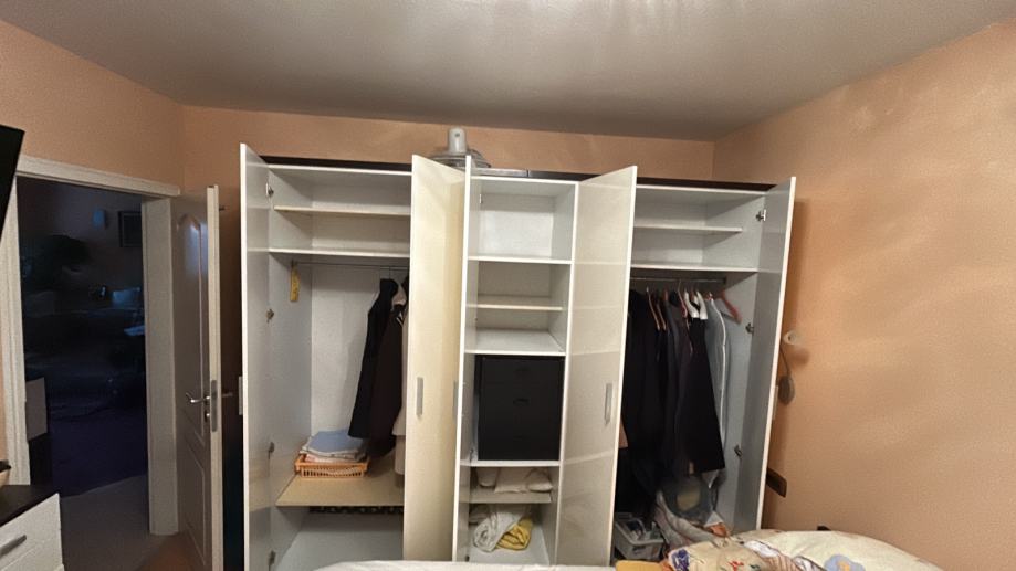 Ormar je bijele boje s tamnim (drvo dekor) okvirom, elegantnog i neutralnog izgleda koji se lako uklapa u svaki prostor. Ima šest vrata s metalnim ručkama te nudi puno prostora za odlaganje odjeće i ostalih stvari. Fronta je glatka i jednostavna za održavanje.