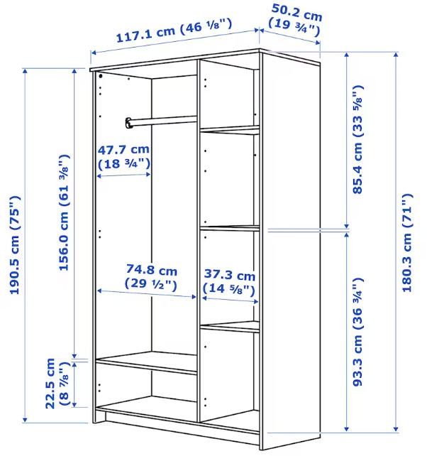 Ormar ima troja vrata, ogledalo, police i šipku za vješalice.