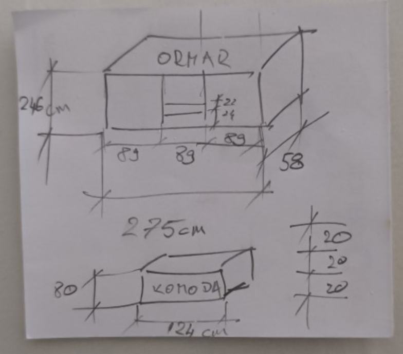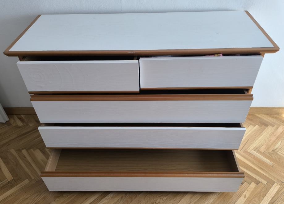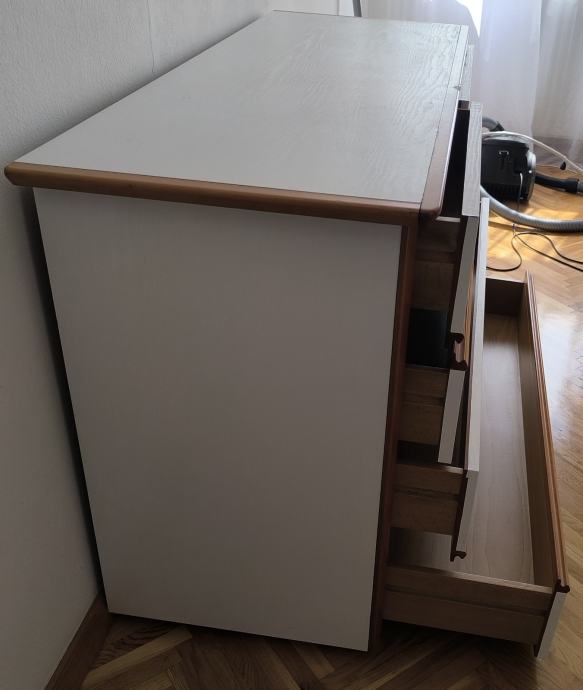 Fronte komode preljepljene bijelom samoljepljivom tapetom (uzorak drva)