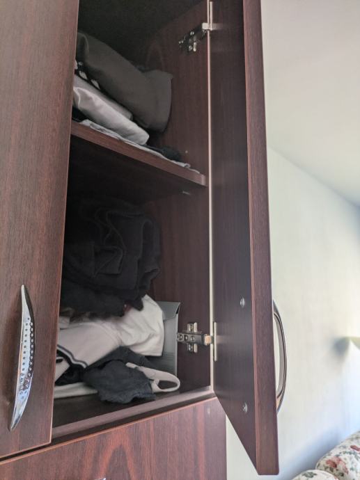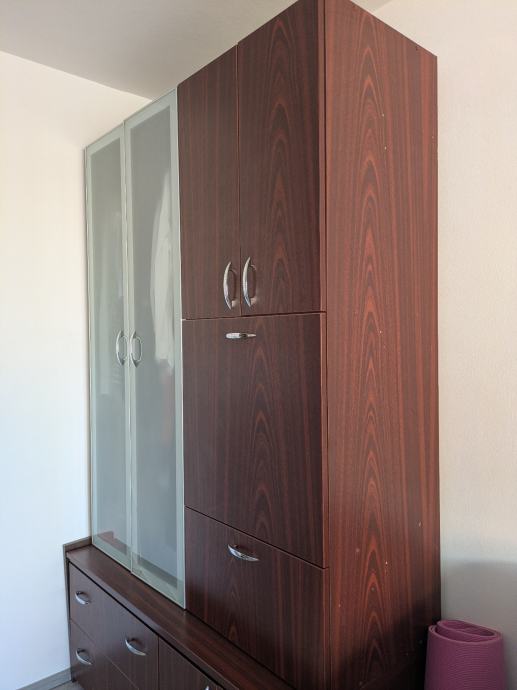 Ormar dimenzija 130*60, napravljen po mjeri od kvalitetnog materijala. Jedino vidljivo oštećenje je na jednom staklu, no može se zamijeniti. Sve police su funkcionalne i ormar uživo izgleda lijepo.