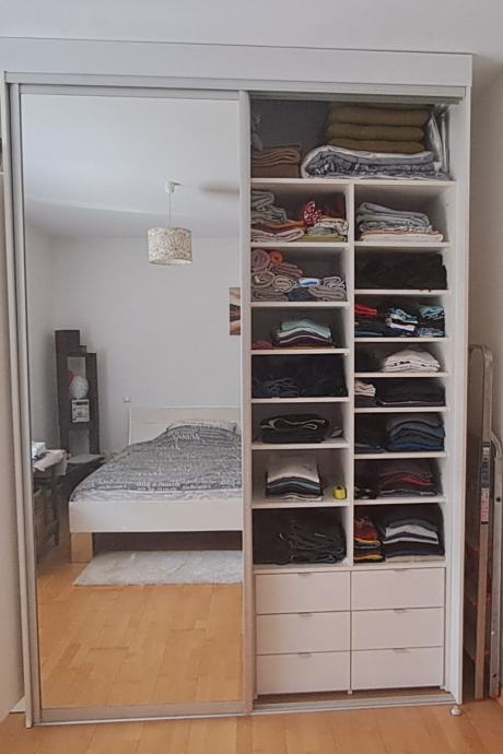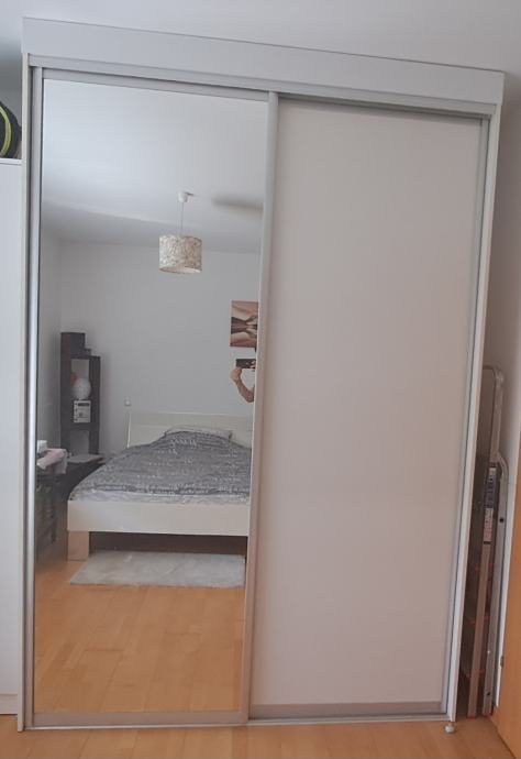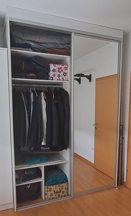 Ormar sa kliznim vratima 181 x 257 cm i dubine 60 cm, sa puno polica, vjeṣ̌alicom i ladicama.