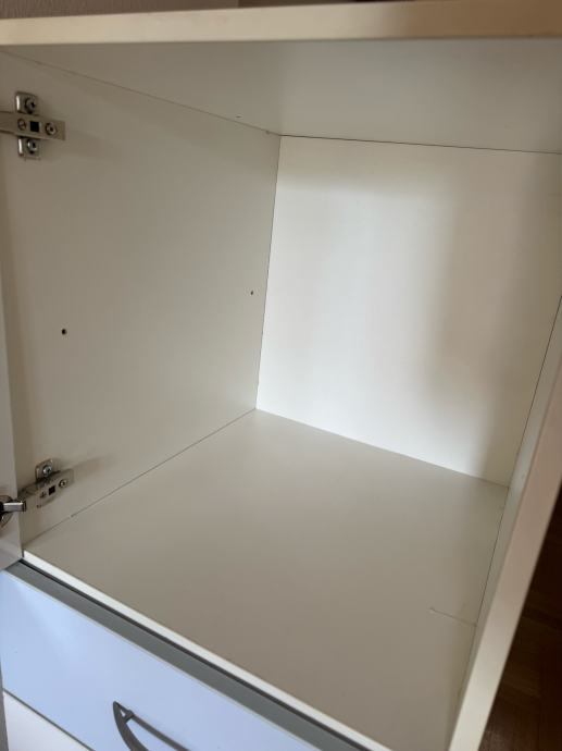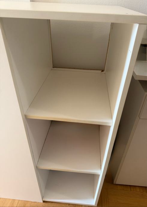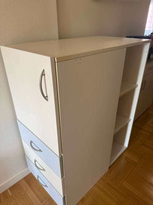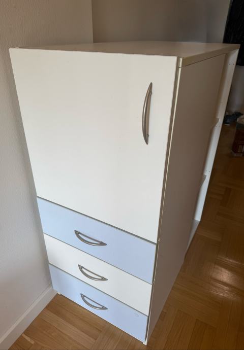 Ormar plavo bijele boje 110 cm visina, širina 49 cm i dužina 90,5 cm. Odlicna kvaliteta. Sastoji se od polica ormarica i 3 ladice