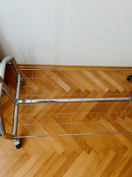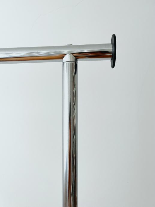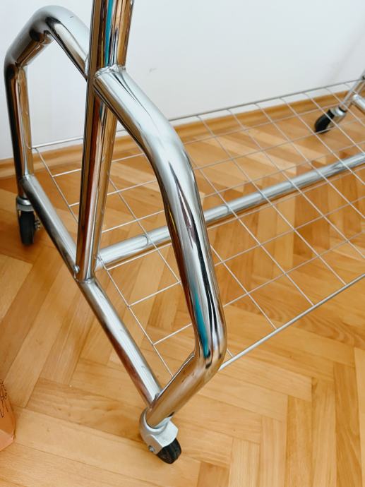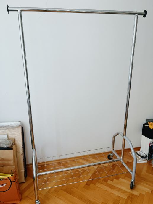 Vrlo čvrsta i stabilna metalna vješalica za odjeću na kotačima.