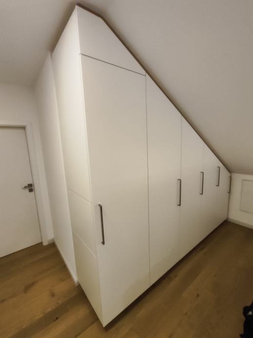 Izrađujemo moderne i funkcionalne ormare po mjeri, savršeno prilagođene vašem prostoru – bilo da se radi o ravnim zidovima, potkrovljima ili zahtjevnim kosinama. Svaki element planiramo prema vašim potrebama kako biste dobili maksimalno iskorišten prostor i dugotrajnu kvalitetu.