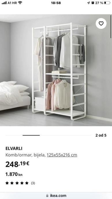 Otvoreni ormar kupljen u Ikei kao nov. Nije korišten. Dimenzije: 125x55x216 U rastavljenom je stanju (vrlo lako sastavljanje) Upute: https://www.ikea.com/hr/hr/p/elvarli-komb-ormar-bijela-s79158144/