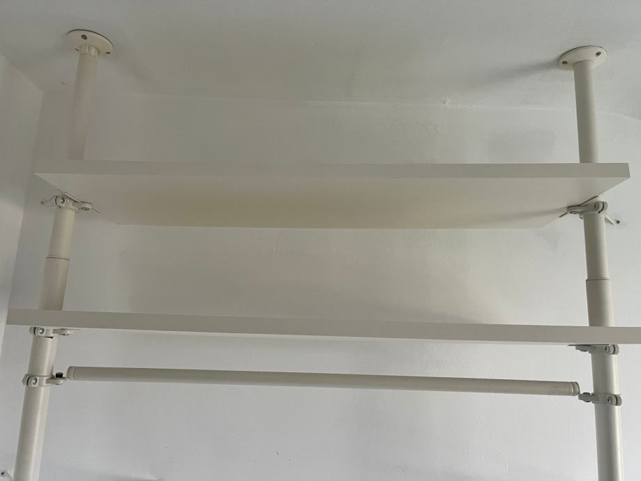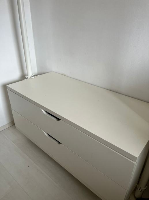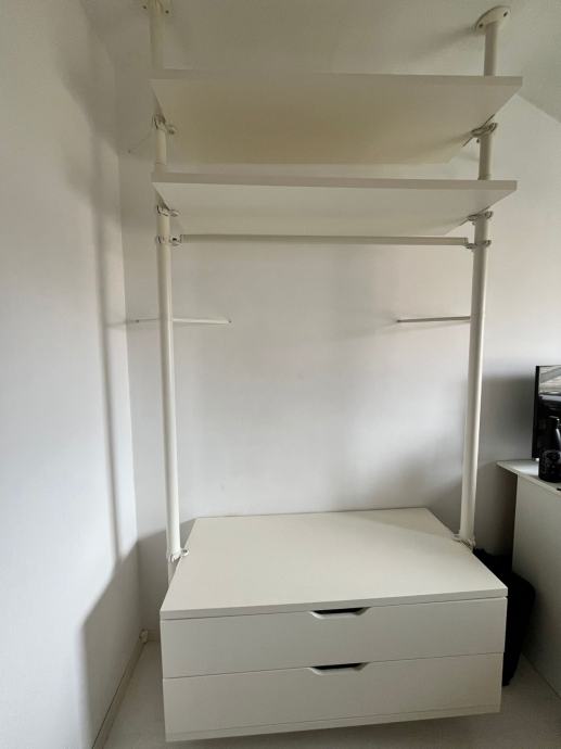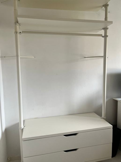 Ima dvije police (od kojih je jedna lagano nakošena, vidljivo na slici), dio za vješalice i dvije duboke ladice. Ispod ormara moguće je staviti i dodatne kutije i jako oslobađa male prostore.