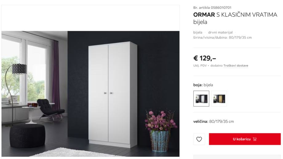 Prodajem ormar za spavaću sobu, dimenzije: visina 180cm, širina 80cm, dubina 35 cm. Kupljen u svibnju 2025. u Lesnini za 130 eura, praktički nov i potpuno očuvan, prodajem zbog kupnje većeg ormara. Potrebno ga je razmontirati. Samo osobno preuzimanje!