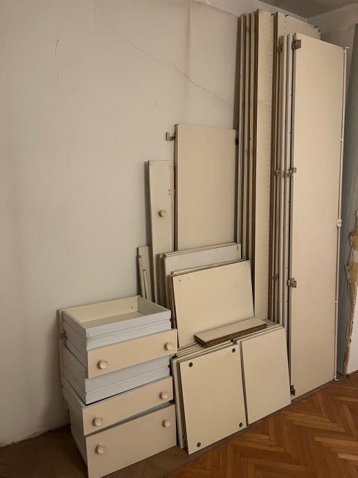 Poklanjam veliki ugradbeni ormar bijele boje, dimenzija 3 m širine i 2,5 m visine. Ormar se sastoji od više odjeljaka s krilnim vratima, šipkama, brojnim policama i ladicama u donjem dijelu. Rastavljen je i spreman za transport.