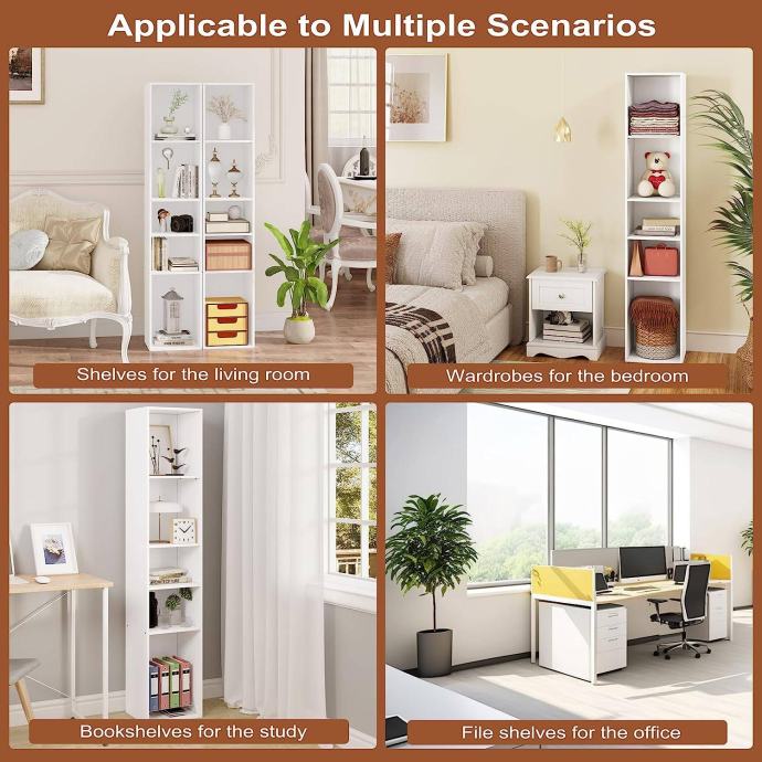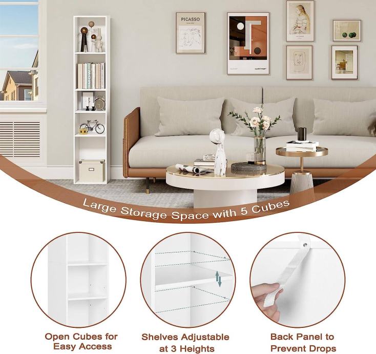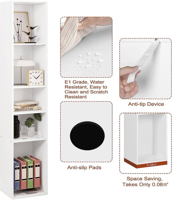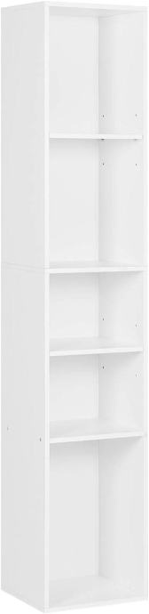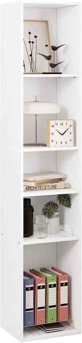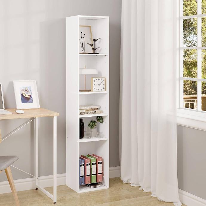 Ova otvorena polica za knjige s 5 pretinaca praktično je i moderno rješenje za pohranu i organizaciju prostora. Zahvaljujući uskom i visokom dizajnu, zauzima vrlo malo podne površine, a nudi dovoljno mjesta za knjige, dokumente, ukrase, biljke i druge predmete.