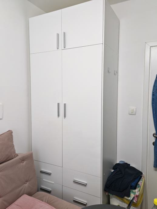 Prodajem ormar za sobu, bijeli visoki sjaj. Dole 4 ladice, iznad ladica 2 krila, u jednom poličar, drugi za vješanje robe. I najgornji police. Vidi priložene fotografije. Nekoliko mjeseci je staro, kao novo. Visina ormara je 238 cm, širina 90 cm, dubina 52 cm. Prijevoz kupca