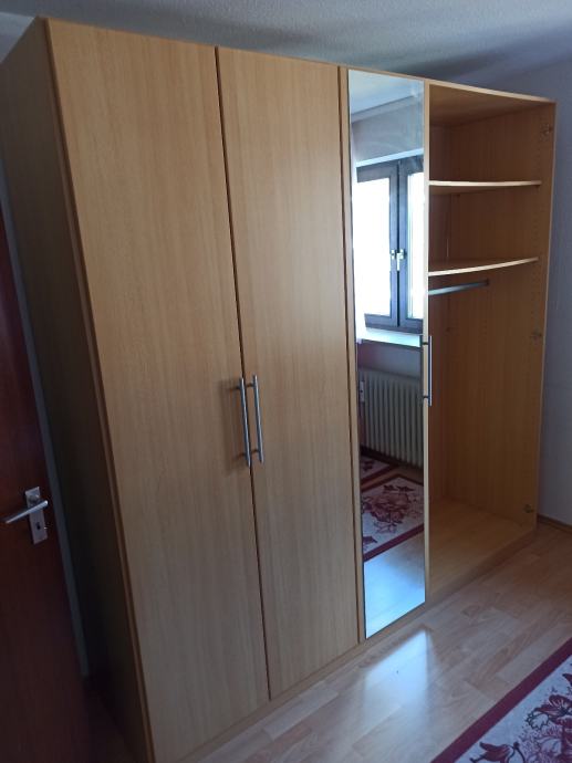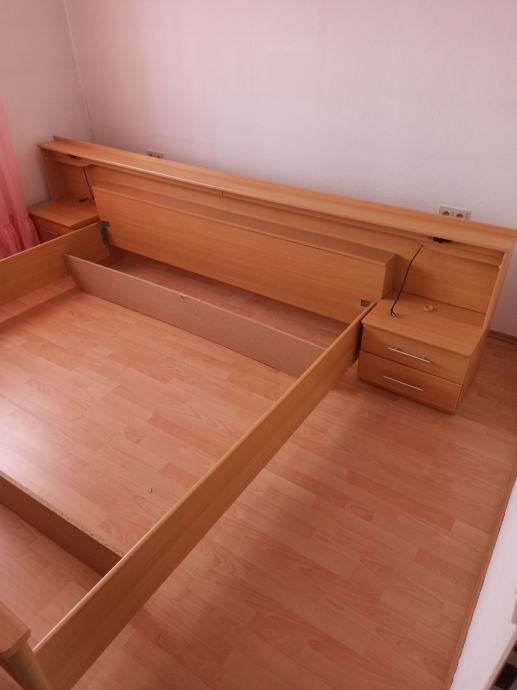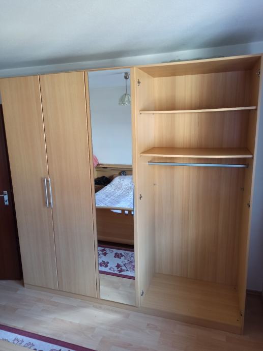 5- krilni ormar, sirine 250 cm, visine 220 cm. Bracni krevet sa nocnim ormaricima i podnicama