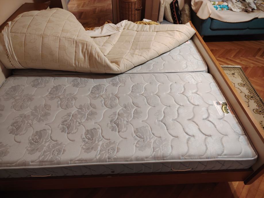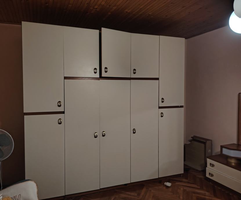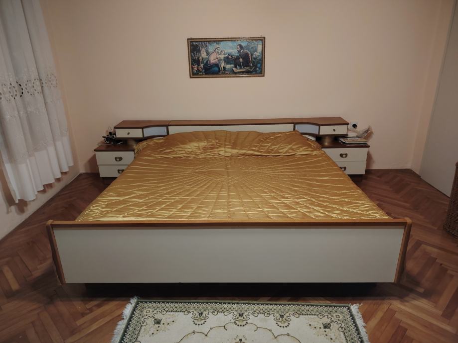 Prodaje se kompletna spavaća soba u vrlo dobrom stanju. Krevet ima dva udobna madraca 90x190, rasvjetu u sklopu kreveta. Komoda s ogledalom je visoka 145 cm, duljina 150cm, širine 40cm. U ormaru je prostor za vješanje odjeće i police.
