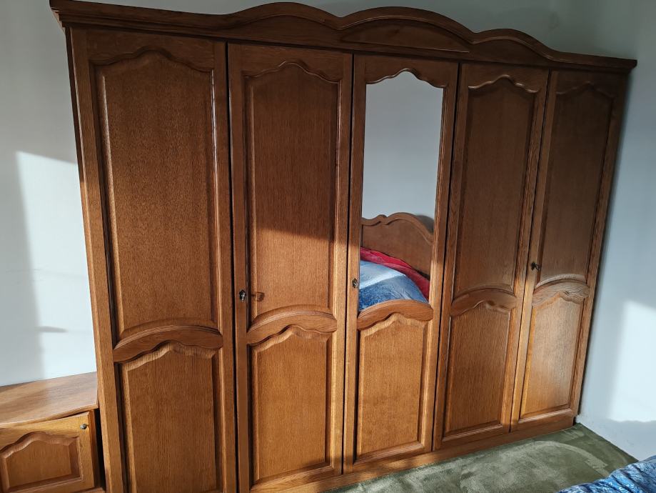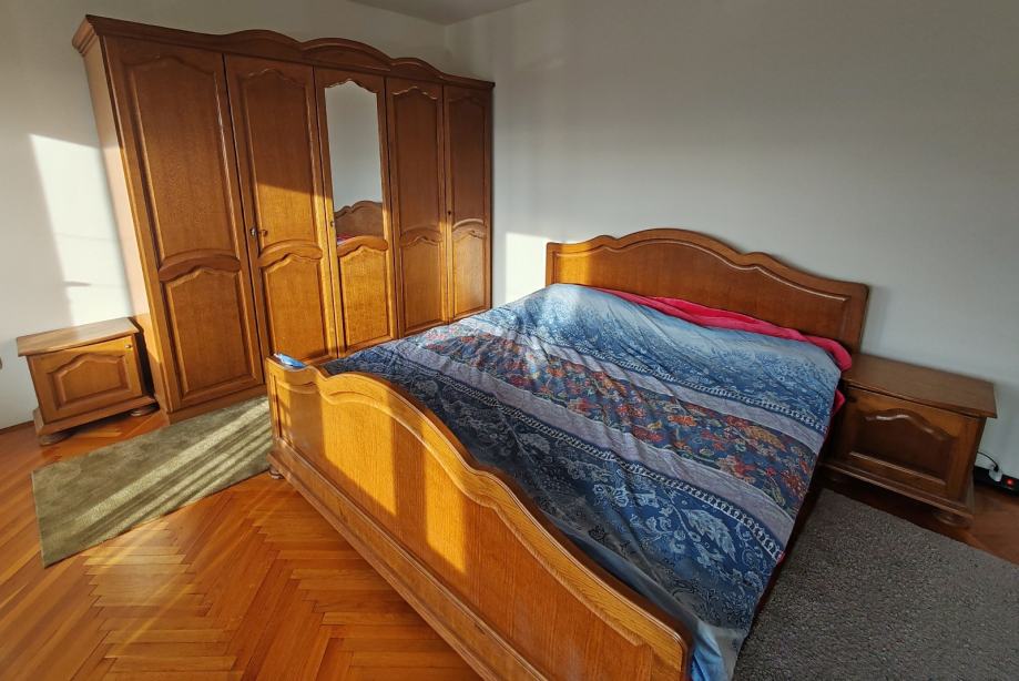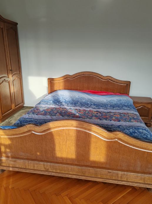 Krevet, 2 nočna ormariča, komoda i ogledalo, veliki ormar (2x dvokrilni vješanje sa jednom policom gore + sredina 4 duboke police).