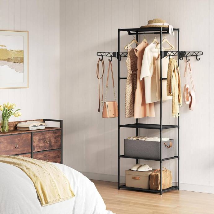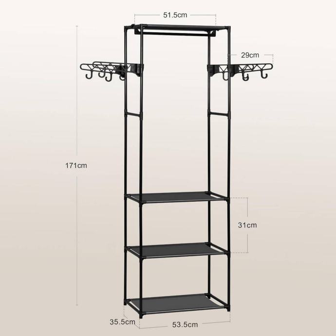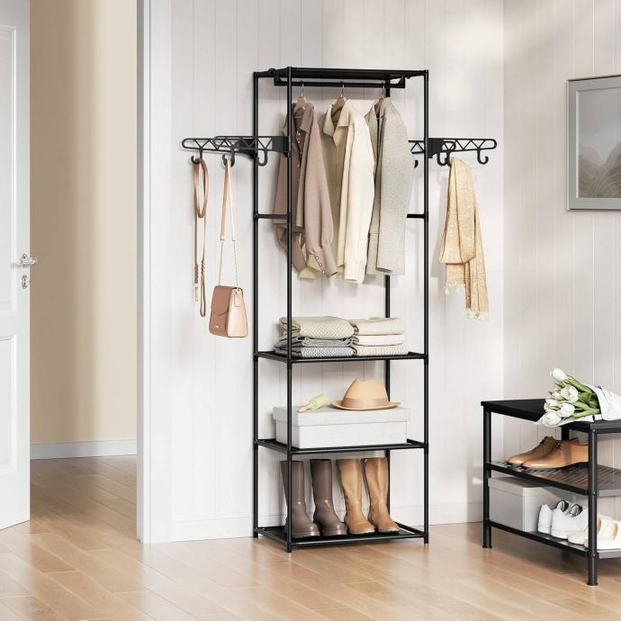 Ovaj stalak za odjeću nudi izvrsnu pohranu za jakne, košulje, haljine, s četiri šipke s po dvije kuke za šešire, torbe i šalove te tri polica od netkanog materijala za cipele, kutije za pohranu i druge predmete. Otvoreni dizajn omogućuje brz i jasan pregled odjeće i drugih stvari, štedeći vrijeme i održavajući prostor urednim.