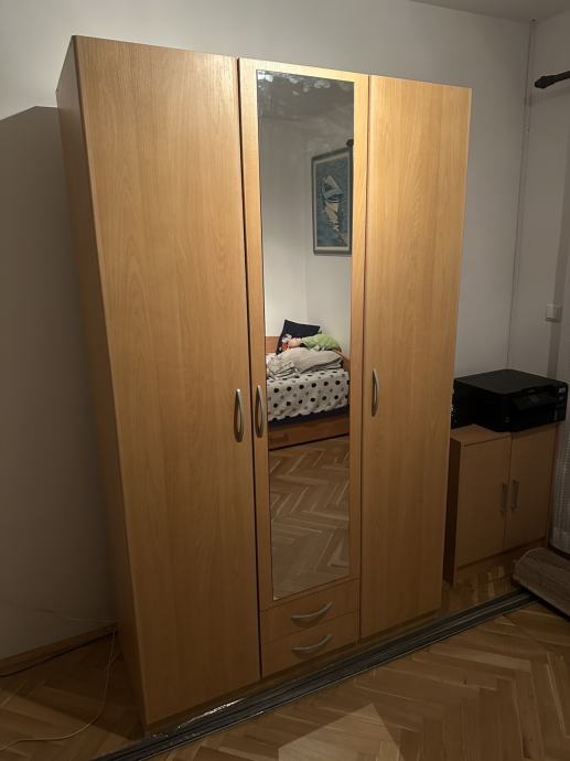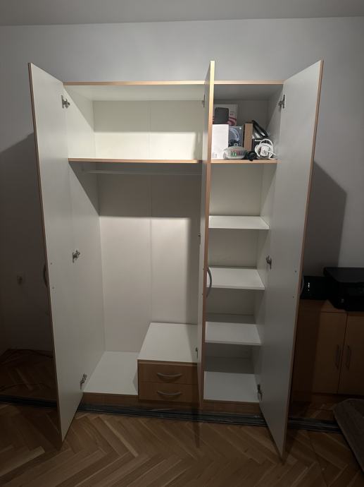 Trokrilni ormar sa ogledalom, 2 ladice, 5 polica, gornje duboke police, prostor za vjesalice. Police su zasebno kupljene. 200cm visina/ 120cm sirina/ 50cm dubina. Maksimalno ocuvano u super stanju. Minimalna greska uslikana na slici, dolje desno. Ostecenje nastalo prilikom transporta. Moguca dostava na podrucju Osijeka.