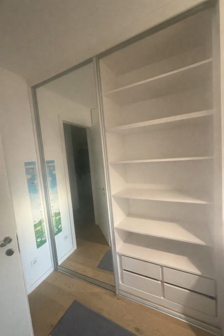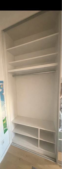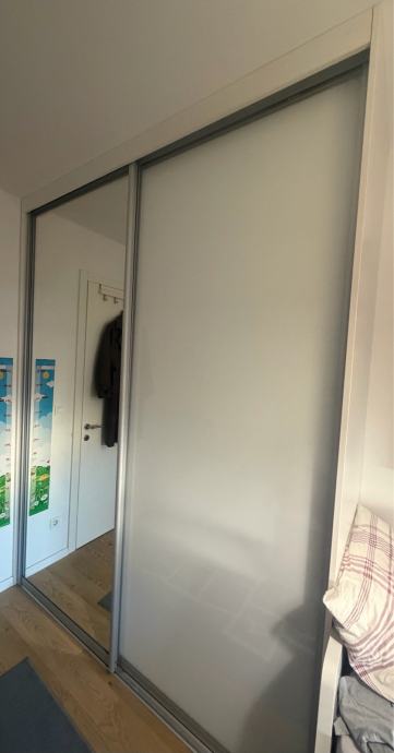 Ugradbeni ormar, sa kliznim vratima, ugrađen prije 2,5 godine, jedna vrata su sa ogledalom a druga lacobel bijeli, stoperi na vratima, dimenzije 265x200x67