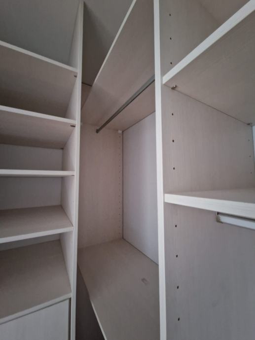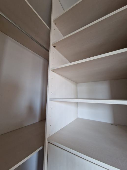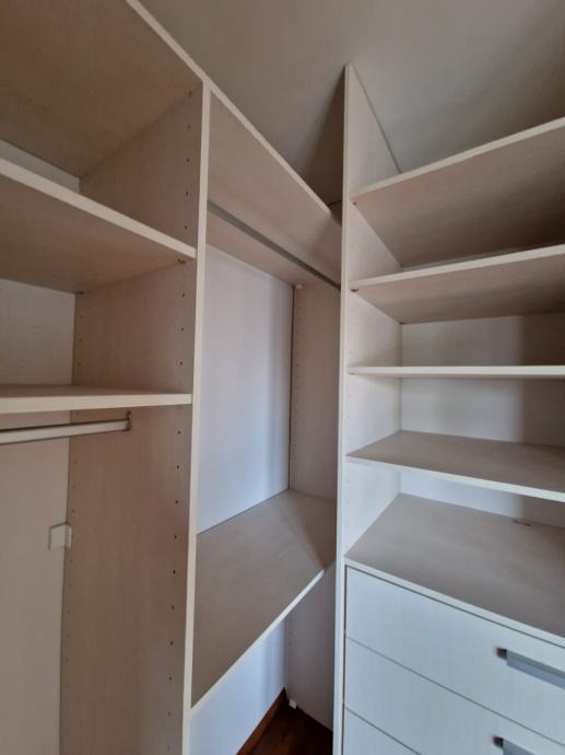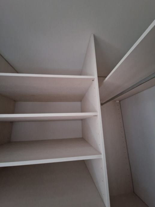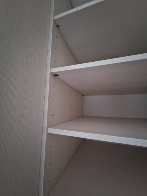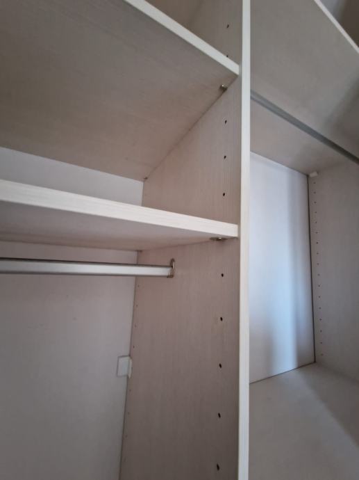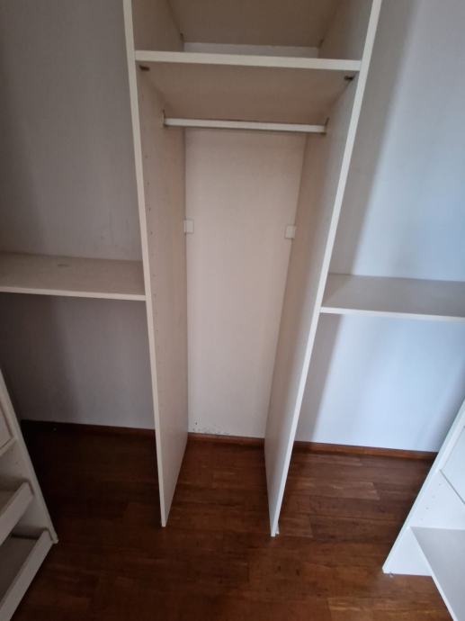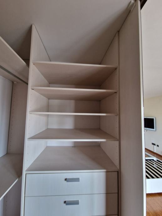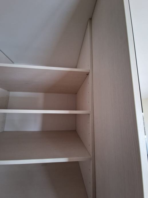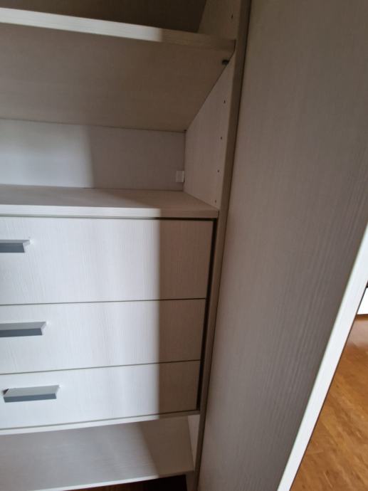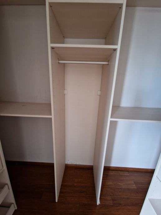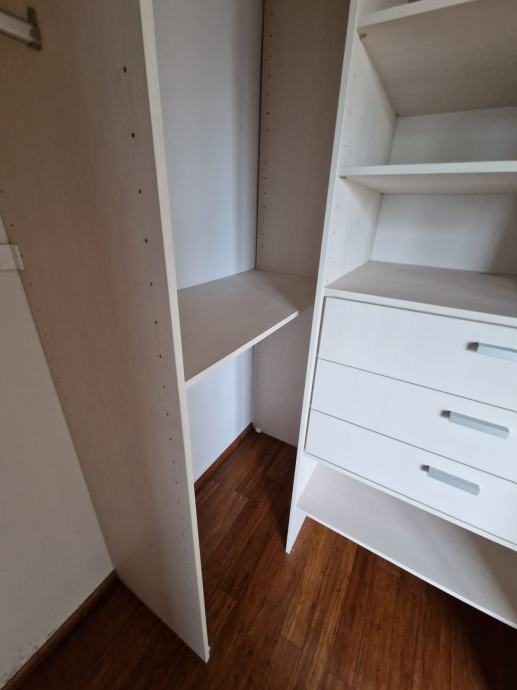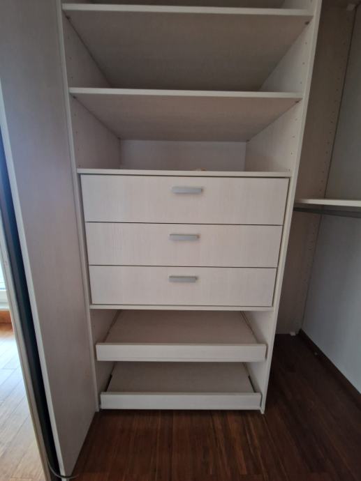 Prodajemo ugradbeni ormar walk in. Središnji dio se sastoji od 4 kom kratkih vješanja i jednim dugačkim dimenzija 275 x 270 x 50 cm dubine. Bočni dijelovi su identični sa tri ladice (nemaju stopere) i policama dimenzija 90 x 270 x 65 cm dubine. Ormar je bez oštećenja i trenutno rastavljen. Prednje stranice (fronte) čine fiksne lijeva i desna stijena sa ogledalom po cijeloj širinu i visini , a središnji dio su klizna vrata koja su također u ogledalu po cijeloj širini i visini. Ogledalo je zatamnjeno u Champagne boji. Dimenzije ogledala su 90x270.