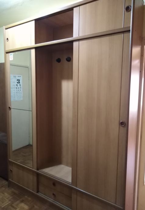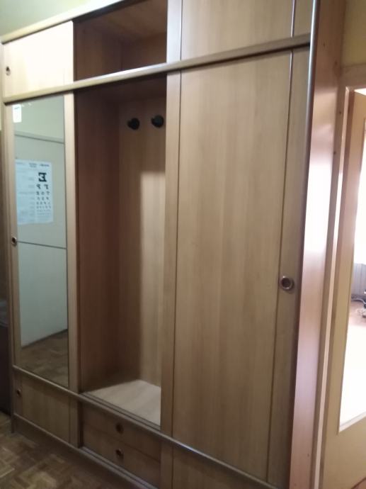 - sredina: 1 uski ormar sa policama i kliznim vratima, sredina sa vješalicom, 1 uski ormar sa šipkom i kliznim vratima