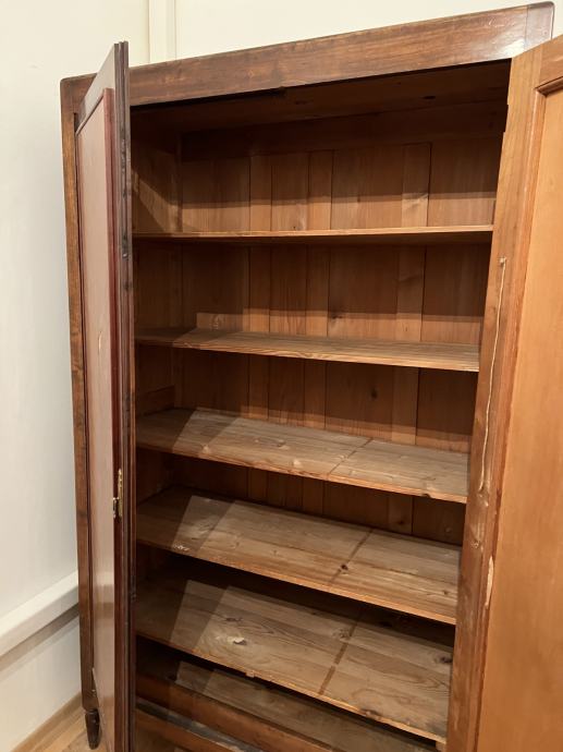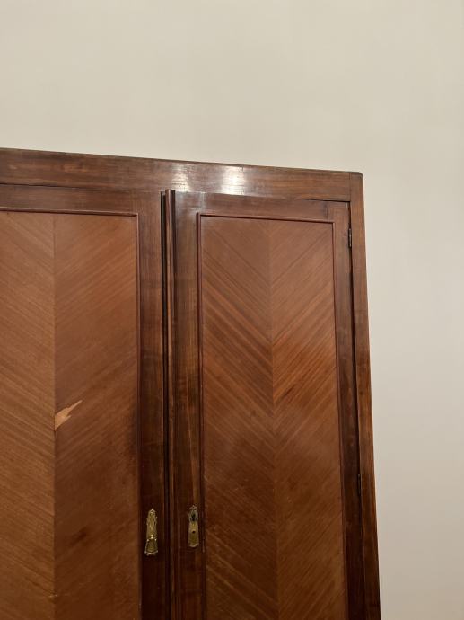 Prodajem vintage drveni ormar iz doba secesije. Riječ je o starinskom komadu s intarziranim stranicama i frontama u uzorku riblje kosti. Masivna konstrukcija i dekorativni detalji daju mu prepoznatljiv karakter tog razdoblja.