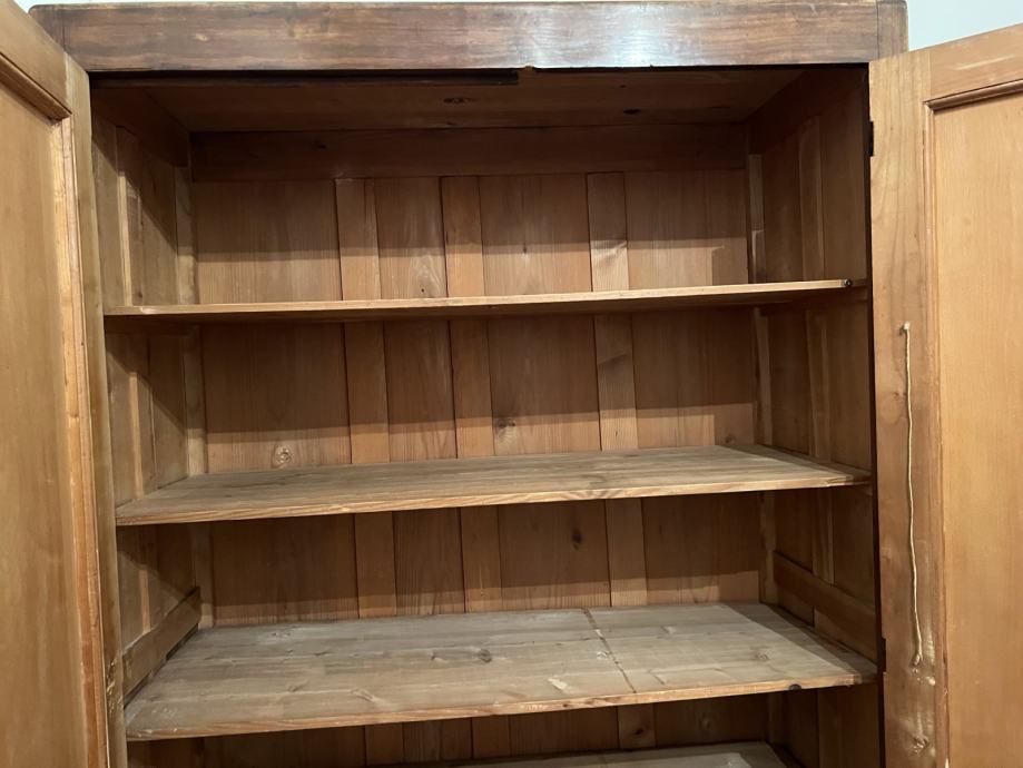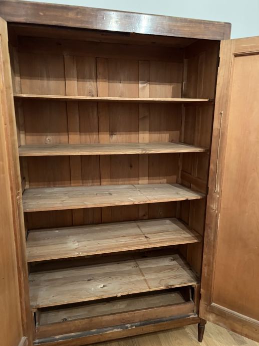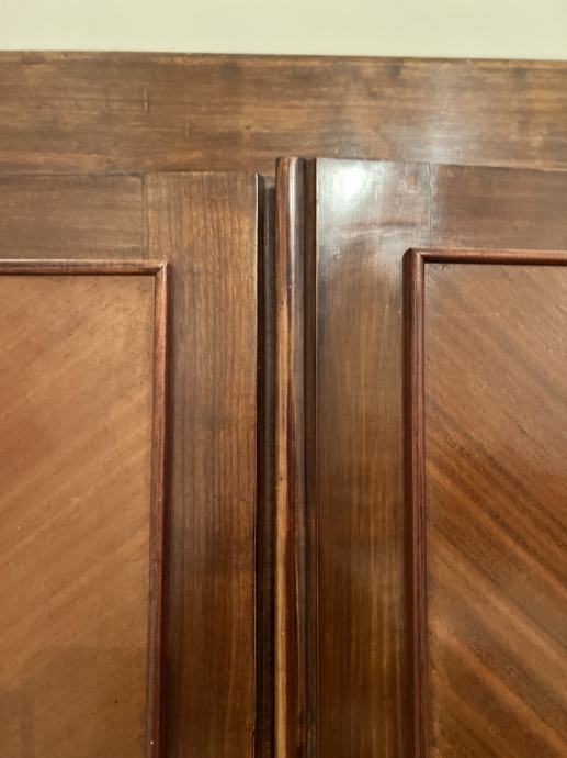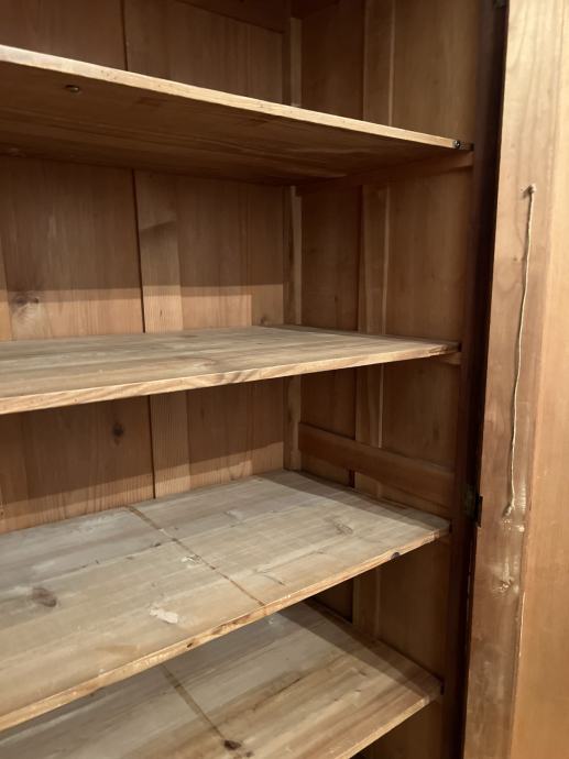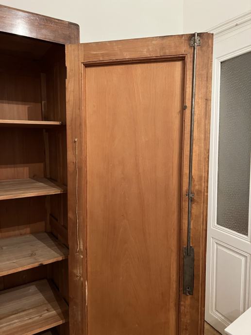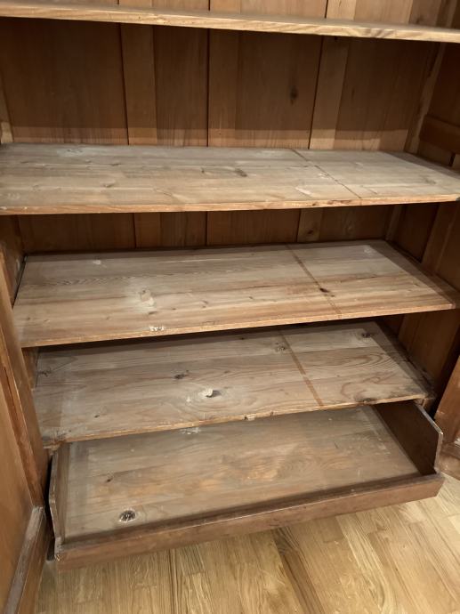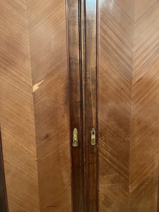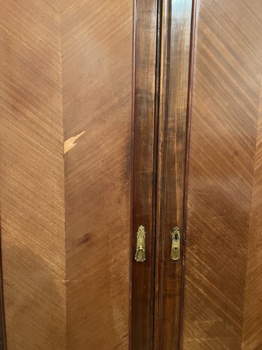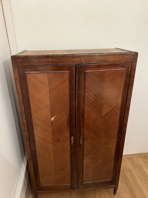 Ormar je stabilan i funkcionalan, ali ima vidljiva oštećenja od korištenja kroz godine. Na vratima i površini prisutni su tragovi habanja, a desna ručkica je pukla i potrebno ju je zamijeniti ili restaurirati. Idealan je za nekoga tko se bavi obnovom namještaja ili želi autentičan komad uz manju restauraciju.