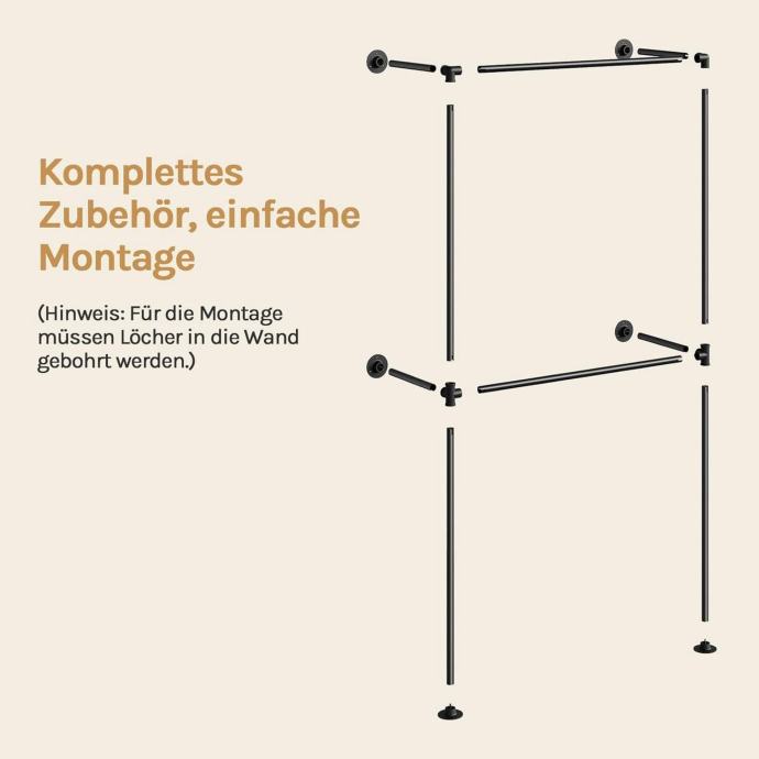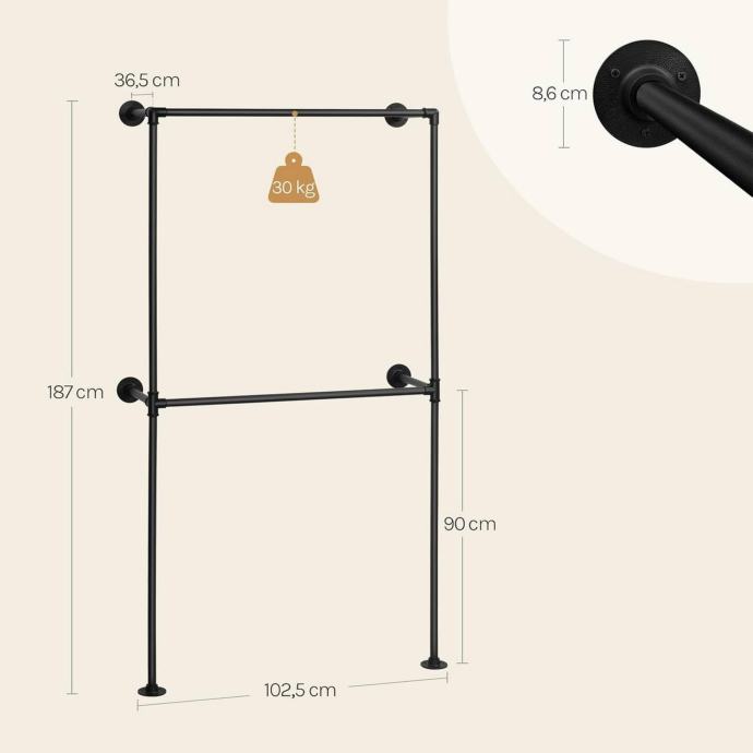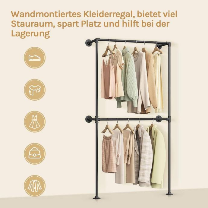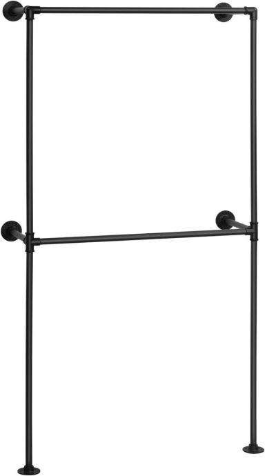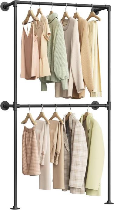 Ova zidna vješalica s dvije šipke izrađena je od visokokvalitetnih metalnih cijevi s crnim premazom, što osigurava dugotrajnost i otpornost na hrđu. Svaka šipka može nositi do 30 kg, a vješalica je idealna za organizaciju odjeće kod kuće ili u uredu.