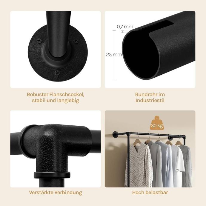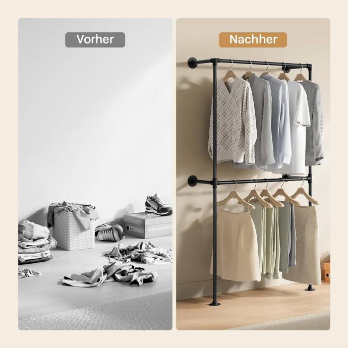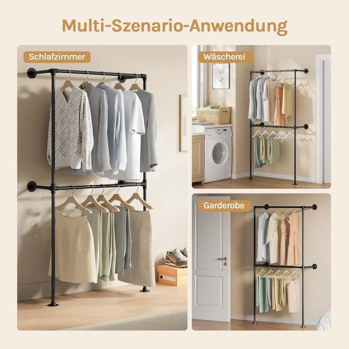 Veliki kapacitet omogućuje vješanje svakodnevne odjeće bez stvaranja nabora, a otvoreni industrijski dizajn pruža jednostavan pristup odjeći, olakšava organizaciju i štedi prostor u manjim stanovima ili sobama. Water pipe stil s flanšama kombinira praktičnost i moderan minimalistički izgled, savršeno se uklapajući u dnevne sobe, spavaće sobe, studije ili trgovine odjećom.