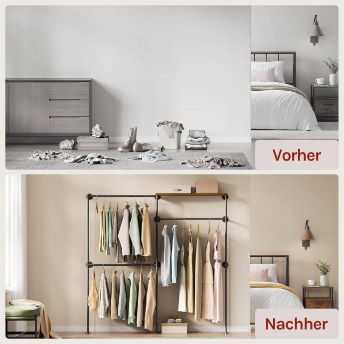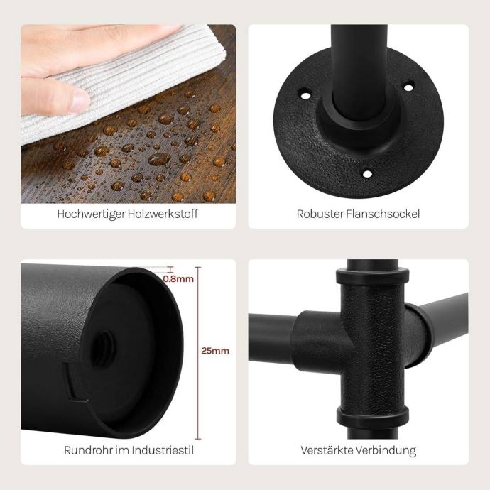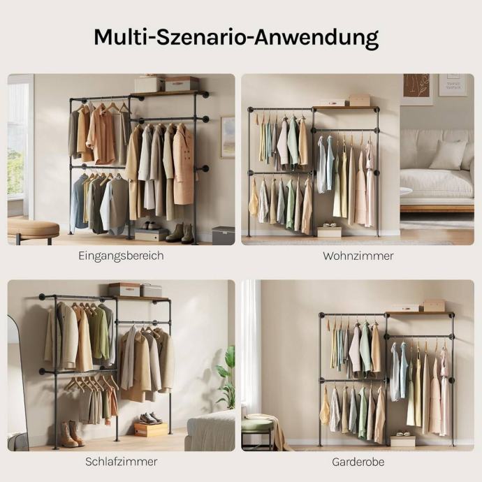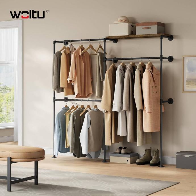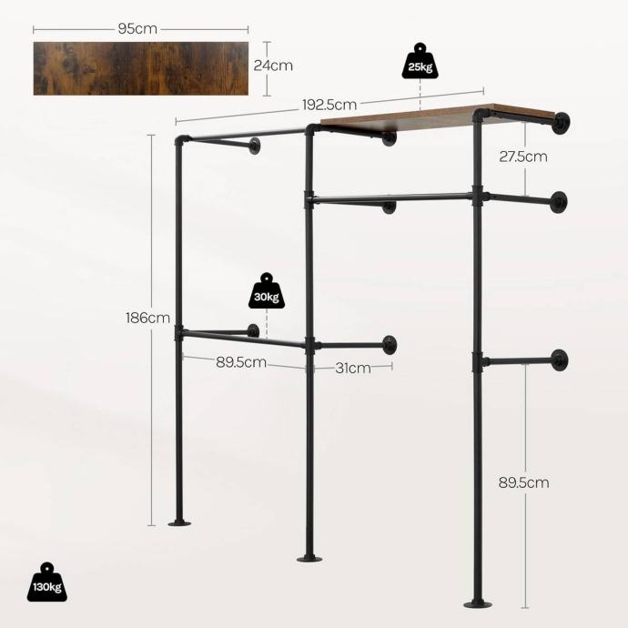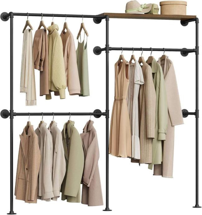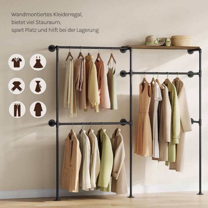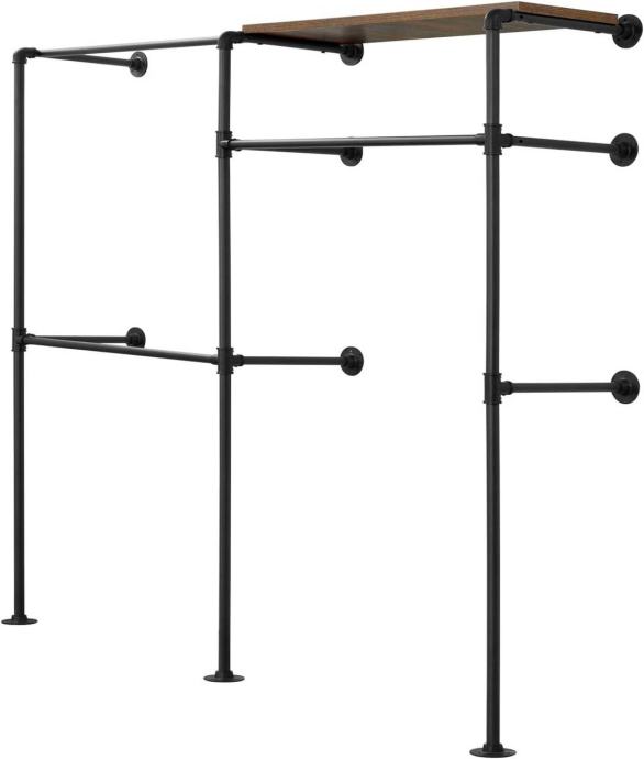 Otvoreni dizajn maksimalno iskorištava zidni prostor, štedi prostor i omogućuje bolje organiziranje kaputa, haljina, odijela, hlača, remena, šalova, kravata i drugih predmeta. Kombinacija crnih metalnih cijevi i police u vintage smeđoj boji unosi industrijski vintage ugođaj u svaki prostor, poput dnevnog boravka, spavaće sobe, garderobe ili studija.