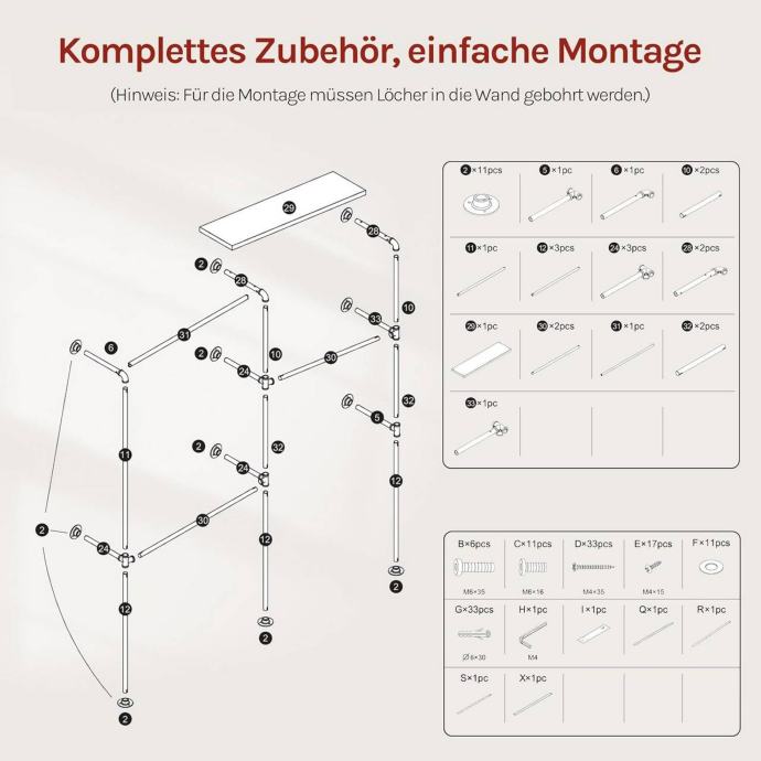 Za montažu je potrebno bušenje u zid, dok je bušenje u pod opcionalno za dodatnu stabilnost. Dolazi s kompletnim priborom za montažu i ilustriranim uputama.