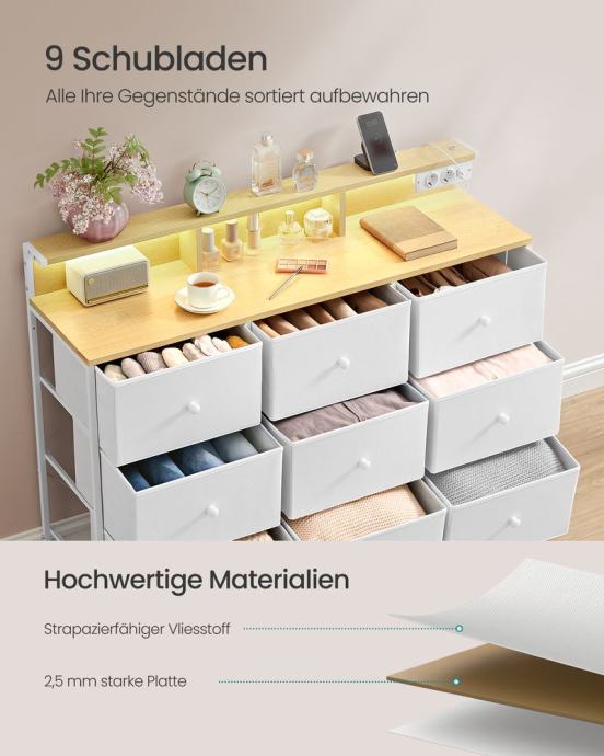 Uz kontrolu na dodir možete prilagoditi LED osvjetljenje i stvoriti atmosfersku atmosferu; 2 AC utičnice i 2 USB priključka omogućuju vam jednostavno punjenje mobitela, stolne lampe i drugih uređaja. Zahvaljujući vrhunskoj iverici, izdržljivoj tkanini i čvrstom čeličnom okviru, ova komoda je izdržljiva i otporna; Podesive nožice kompenziraju neravne podove. Sklopive ladice, označeni dijelovi i jasne upute čine sastavljanje 33,5 x 114 x 84 cm bijelog ormarića s ladicama jednostavnom. 9 prostranih ladica za razvrstavanje i spremanje odjeće, deka, šalova itd., otvoreni pretinci za lak pristup proizvodima za njegu kože i parfemima, povišena polica za ostale sitnice - sve ima svoje mjesto. Ovaj ormarić za pohranjivanje može se staviti ne samo u spavaću sobu, već i u dnevni boravak ili hodnik. To znači da su vaša odjeća ili druge svakodnevne stvari uvijek uredno pospremljene. Za sve informacije nazovite na broj telefona 092/399-75-19