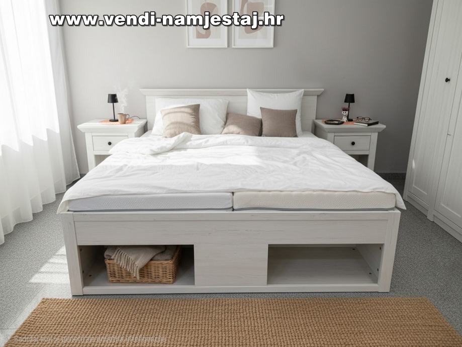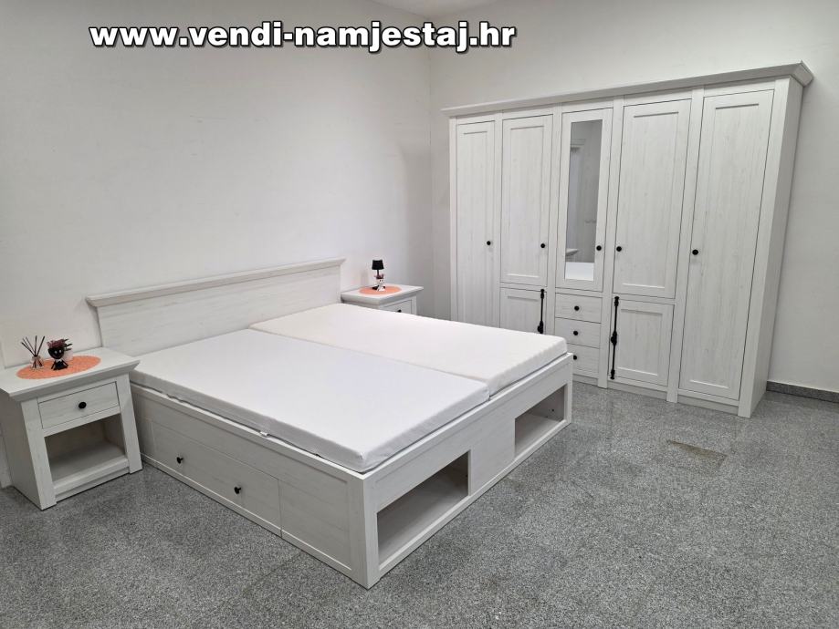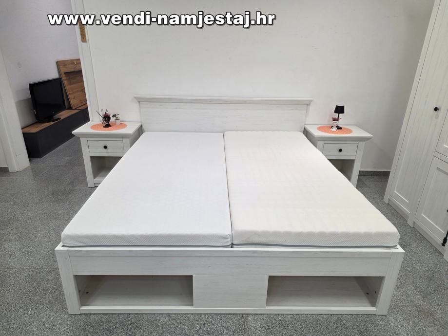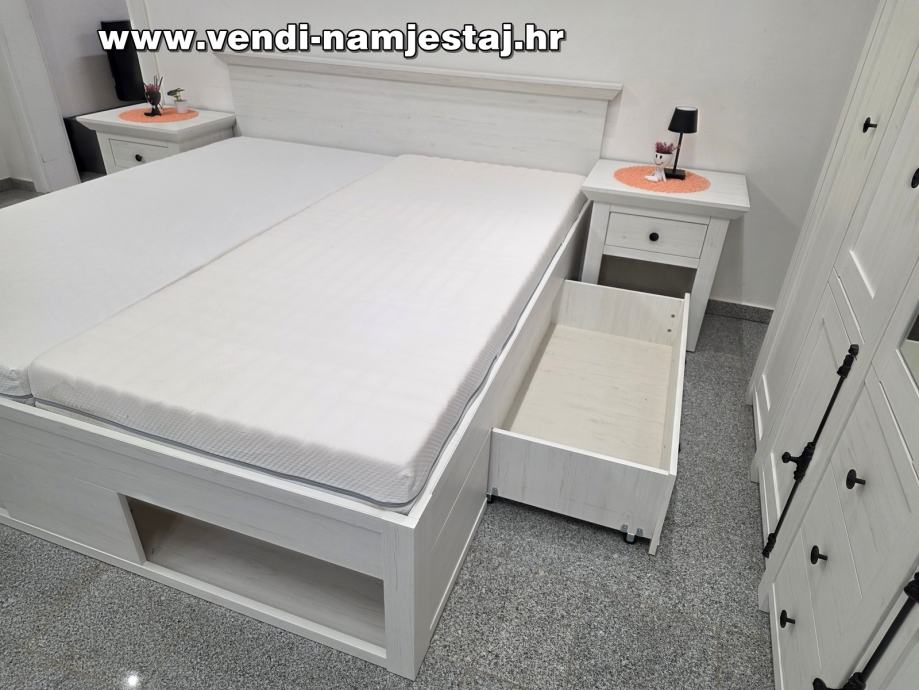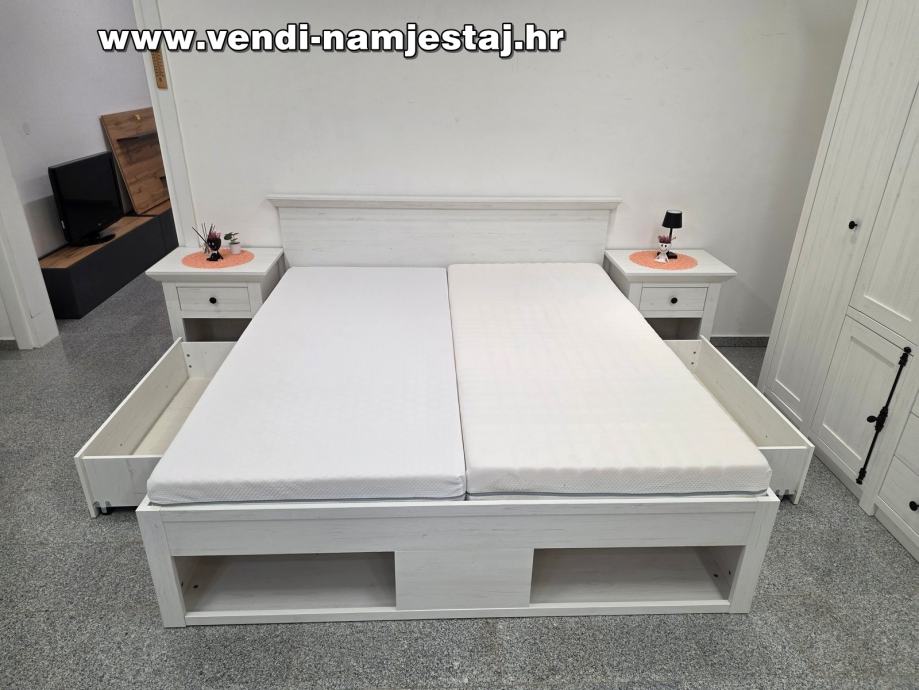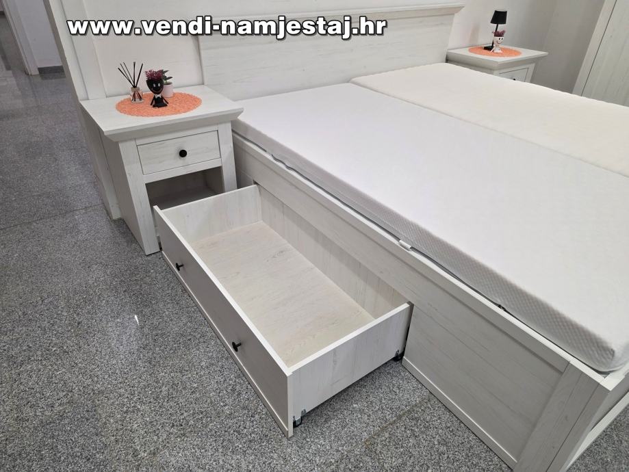 Kompletan bračni krevet sa podnicama, madracima, noćnim ormarićima, ladicama, spremištem