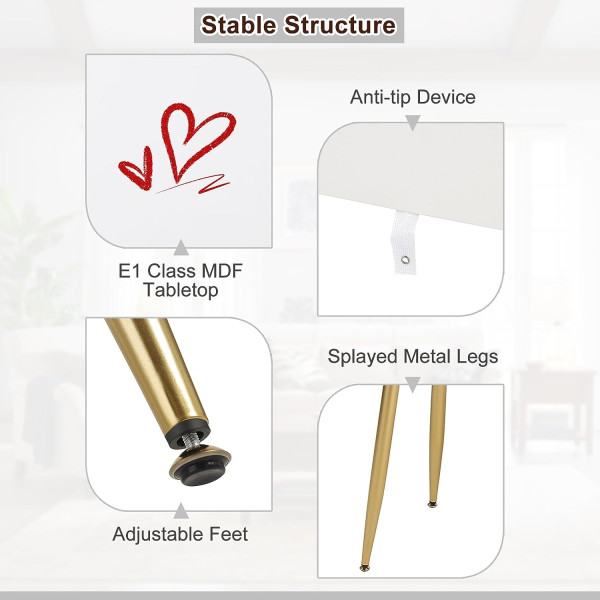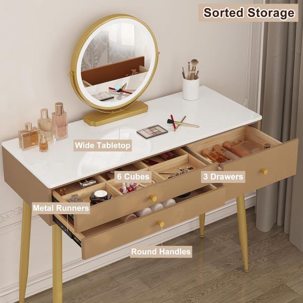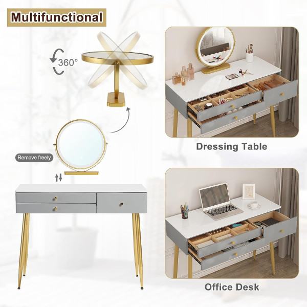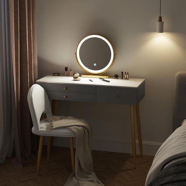 Toaletni stol dolazi s okruglim zrcalom (φ 40 cm), čije ugrađeno LED svjetlo ima funkciju prigušivanja, tj. 3 temperature boje, i pametni gumb na dodir koji osigurava pravo svjetlo za nanošenje šminke. Nudimo i odgovarajuću stolicu za šminkanje podstavljenu pjenom visoke gustoće u mekanoj baršunastoj presvlaci. Kut njegovog ergonomskog naslona može se podesiti za udobno šminkanje ili njegu kože. Ploča stola (100x40 cm) i 3 ladice (od kojih jedna ima 6 pretinaca) nude prostor za vaše proizvode za njegu, kozmetiku, nakit, dodatke itd., tako da se mogu razvrstati, pohraniti na dohvat ruke, a vrh je uredan. Tijelo stola izrađeno je od E1 MDF-a i presvučeno PVC-om s 4 strane; Raširene metalne noge osiguravaju čvrsto postolje. Podesivi jastučići za noge i zaštita vrha povećavaju stabilnost i sigurnost. Toaletni stolić s ogledalom i tabureom je jednostavan, moderan. Siva i zlatna boja prilagođavaju se svakoj spavaćoj sobi. Bez ogledala to je radni stol ili stol za računalo. Idealan poklon za djevojčice! Za sve informacije nazovite na broj telefona 092/399-75-19