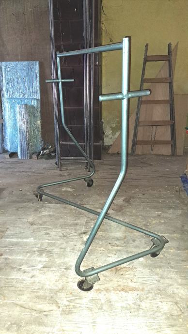 Prodaje se profesionalni, mobilni stalak za odjeću, izrađen od čeličnih cijevi, vrlo robustan i podnosi velika opterećenja. Lak na horizontalnoj prečki je oštećen od željeznih kuka vješalica. Dimenzije stalka su 70 x 125 x 134 cm.