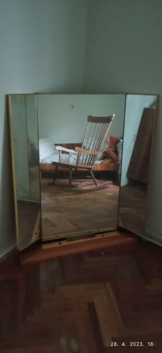 Prodajem ogledalo s postoljem i bočnim krilima koja se mogu zakretati. Postolje je potrebno dodatno učvrstiti za podlogu. Širina 30+80+30 cm visina 120 cm. Samo osobno preuzimanje.