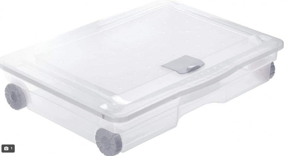 Prozirna plastična kutija ladica za odlaganje stvari pod krevet, na kotače. Može biti za posteljinu, igračke i slično. 80x61x17cm