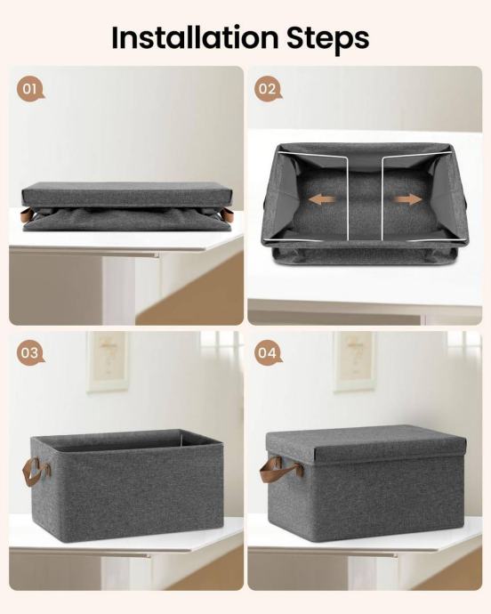 Kutije su izrađene od kationske poliesterske tkanine s poliesterskom podstavom, što ih čini prozračnima, otpornima na kidanje i habanje, postojanima u boji te otpornima na vlagu i statički elektricitet. Plastična donja ploča osigurava stabilnost uz malu težinu. Elegantna siva boja lako se uklapa u različite stilove interijera i idealna je za male prostore.
