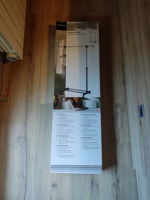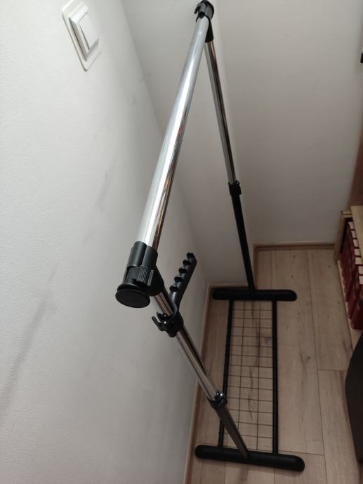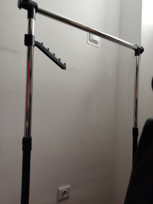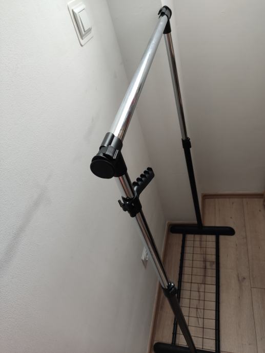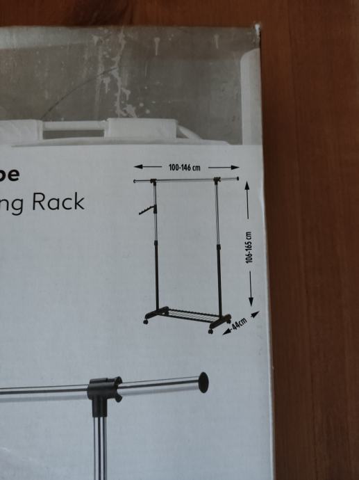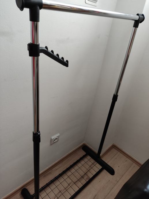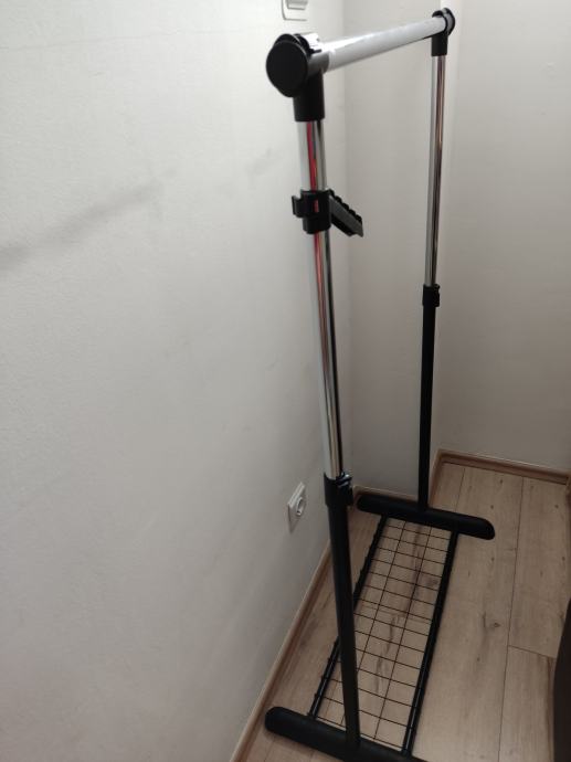 Sklopivi stalak za odjeću šrilagodljive visine (106-165 cm) i širine (100-146). Ima i dodatni stalak za odlaganje npr. torbi.