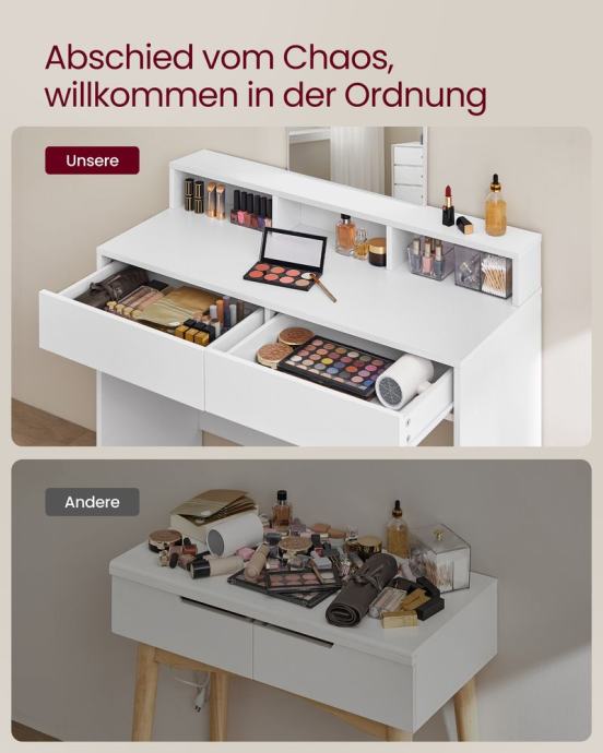 S 2 ladice, velikom pločom stola i 3 otvorena pretinca, ovaj toaletni stolić nudi obilje prostora da svoju šminku držite urednom i nadohvat ruke; S podnom površinom (40 x 100 cm) savršen je za male prostorije. Pričvrstite kozmetički stol na zid s priloženom zaštitom od prevrtanja kako biste stvorili sigurnije okruženje. Ovaj toaletni stol izrađen od kvalitetne iverice robustan je i izdržljiv; njegov premaz je otporan na habanje i lako se čisti, što omogućuje dugotrajnu upotrebu. Ogledalo 40 x 53 cm (Š x V) na toaletnom stoliću omogućuje vam da se jasno odrazite i nanesete besprijekornu šminku. Jednostavan dizajn, čiste linije i elegantna bijela čine ovaj moderni toaletni stolić elegantnim dodatkom vašoj spavaćoj sobi ili garderobi. Za sve informacije nazovite na broj telefona 092/399-75-19