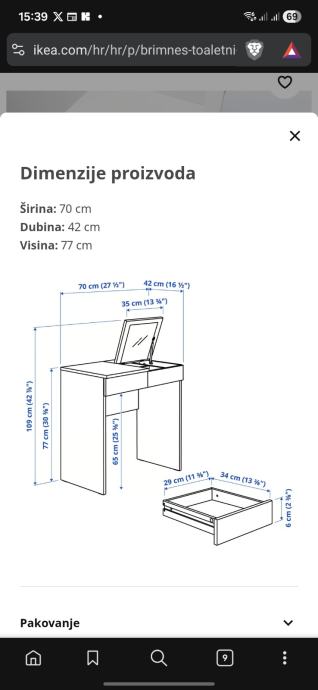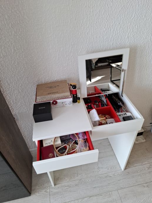 Kao nov, malo korišten. Prodajem Ikea Brimnes toaletni stolić u bijeloj boji. Stolić ima praktičan dizajn s gornjom pločom koja se otvara i otkriva ugrađeno ogledalo te pregradice za odlaganje šminke i sitnica. Ispod se nalazi i dodatna ladica za pohranu stvari. Kompaktan je i ne zauzima puno prostora, a dobro se uklapa u spavaću sobu. Dimenzije na slikama.