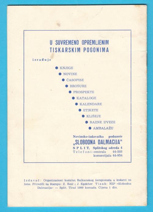 BALKANSKI ŠAMPIONAT U KOŠARCI ZA ŽENE - SPLIT (1968) košarka program