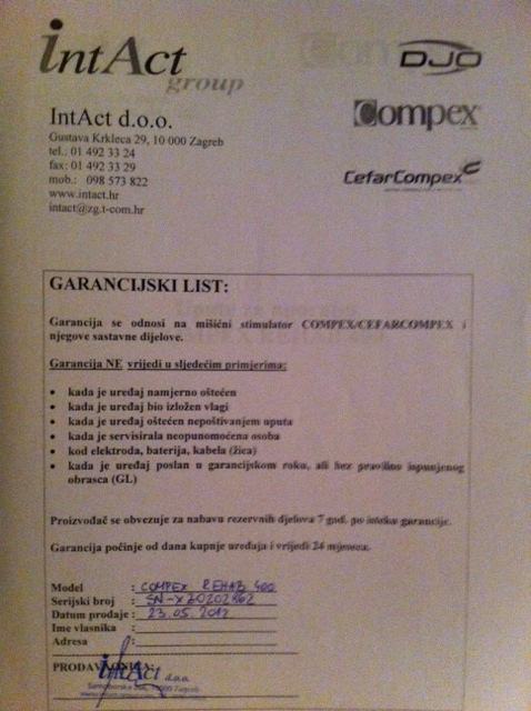 Uređaj je star manje od godinu dana, plaćen 5000kn, garancija vrijedi do 23.05.2014. Korišten je malo, samo za osobnu rehabilitaciju. Komplet se sastoji od dva kompleta malih elektroda, paketa velikih elektroda, punjača, kontakt gela, potrebnih kablova, uputa i samog uređaja Rehab 400.